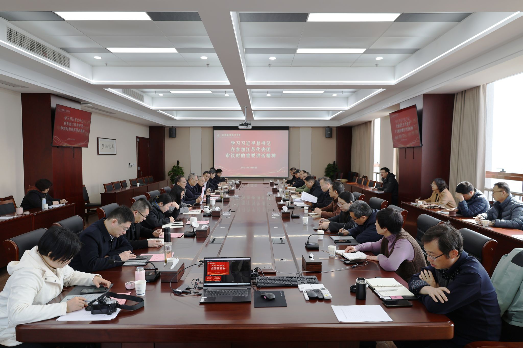 校长周桂瑾重点领学了习近平总书记在参加江苏代表团审议时的重要讲话、在看望参加政协会议的民盟民进教育界委员时的重要讲话,结合习近平总书记寄予江苏“打头阵、勇争先、走在前、作示范”的殷切期望交流了学习体会。随后,与会人员进行了研讨分享,一致认为习近平总书记的讲话立意高远、思考深邃、指向精准,并就讲话精神和实际工作开展了热烈讨论。大家纷纷表示,要在立德树人、科技创新、产教融合、队伍建设和人才培养等全方位贯彻落实习近平总书记重要讲话精神,要敢于先行先试、勇攀高峰,坚持干字当头,努力推进学校办学再上新台阶。