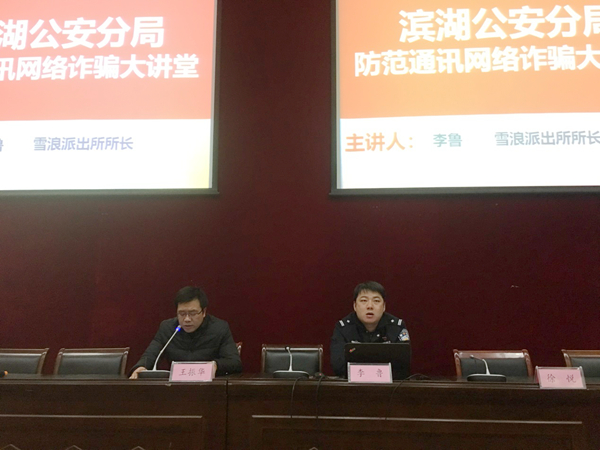 为扎实推进平安校园的建设,切实提高学生的安全防范意识和辨别真伪能力,保障学生人身和财产安全,1218日下午,学校在国交一楼报告厅举办“电信网络诈骗”安全防范讲座。滨湖区雪浪派出所所长李鲁担任主讲嘉宾,全体辅导员、班主任、学生安全信息员共同参加。