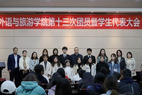 2019年11月19日下午,外语与旅游学院第十三次团员代表暨学生代表大会在青春剧场隆重召开。外语与旅游学院党总支书记江铭、学工办主任周嫄以及院团总支负责老师及135名代表参加了大会。