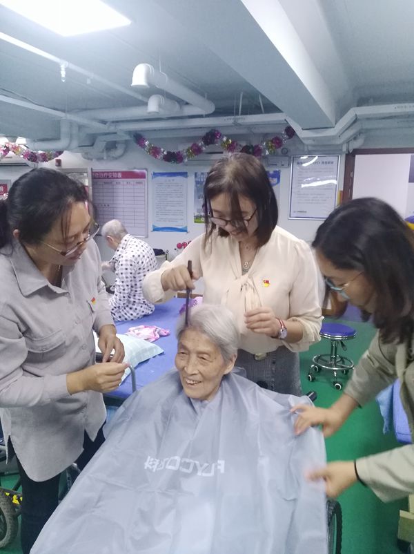 颐泰康复中心以老年患者为主,他们在那里进行治疗和康复训练。支部党员亲切地看望病人,嘘寒问暖,为每人送上一条新毛巾,作为支部党员的一份心意;与老人聊天,手拉着手倾听他们的诉说,鼓励老人们放宽心,多运动;为行动不便的老人理发,虽然党员们工具和手法并不专业,但是认真仔细地剪好每一个老人的头发,让发型清爽,让老人满意。