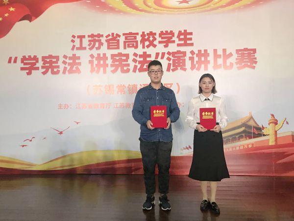 10月12日,由江苏省教育厅主办、苏州大学承办的江苏省高校学生法治知识竞赛和“学宪法讲宪法”演讲比赛(苏锡常镇通片区赛)在苏州大学举办,来自苏锡常镇通地区36所高校的72名选手参加了比赛。经过激烈角逐,与本专科院校学子同台竞技,我校财经学院会计41851班洪龙飞同学在知识竞赛中勇夺二等奖,管理学院云商创新班18级吴沁珂同学在演讲比赛中获得三等奖。