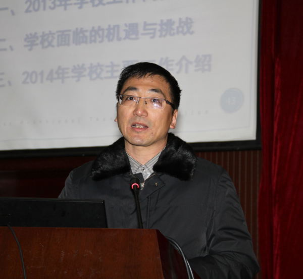 大会由党委副书记谈向群主持。龚方红校长作学校2013年工作报告,全面回顾了2013年各项工作,分析了学校未来发展面临的机遇和挑战,部署了2014年学校重点工作。龚方红校长在报告中指出,2014年我校要深入学习贯彻党的十八大及十八届三中全会和习近平总书记系列重要讲话,坚持“教学中心地位”不动摇,以“校企合作提升年”为主线,以人才队伍建设和科研能力提升为重点,转变观念、抓好常规、突出重点,优化管理、提高质量,努力创建“国内一流、国际水准、特色鲜明”的高职名校。龚方红校长还从巩固和深化教育实践活动成果、加强和改进党建与思想政治工作,坚持教学中心地位、夯实内涵建设,加强高职本科研究和实践、凝练学校特色等9个方面具体对2014年的重点工作进行了部署。
