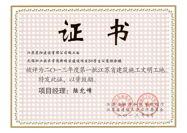 近期,根据《江苏省建筑施工省级文明工地评审暂行办法》文件精神,由江苏省住房和城乡建设厅组织开展了建筑施工省级文明工地考核工作。经考核审定,我校8号学生公寓综合楼项目被评为江苏省2013年第一批建筑施工省级文明工地。