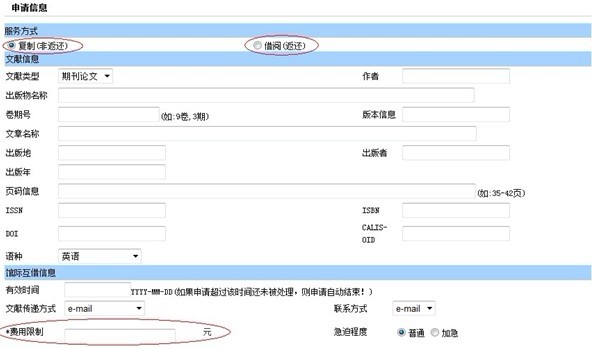 3.进入申请页面,填写所需文献的详细信息,根据需要选择“复制(非返还)”或“借阅(返还)”方式提交申请。其中“费用限制”为必填项(费用限制金额小于100元)。