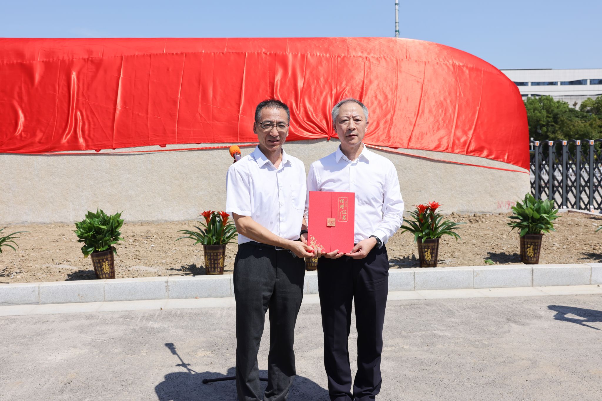 简短致辞后,校企双方代表共同为南大门落成剪彩。龚方红宣布南大门正式落成启用,并为沈剑标颁发捐赠证书。
