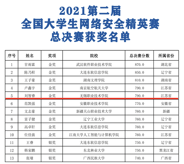 10月30日,第二届全国大学生网络安全精英赛全国总决赛落下帷幕,我校物联网技术学院物联网32033班刘智睿同学获得全国金奖。
