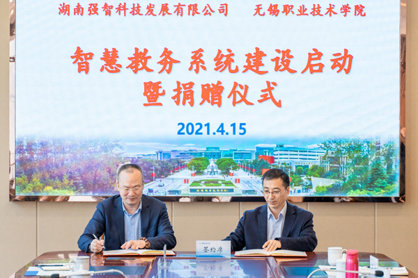 4月15日下午,我校智慧教务系统建设暨捐赠仪式在综合楼F201会议室举行。湖南强智科技发展有限公司董事长谢飞虹、研究院院长程鹏,我校领导龚方红、周桂瑾及教务处、科技处等部门相关负责人参加了活动。
