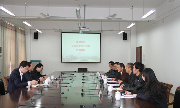 市文明单位创建工作是今年我校的一项重要工作,也得到了市文明办的殷切关注。为了更好地开展相关工作,4月3日上午,市委宣传部部务委员、市精神文明建设指导委员会办公室副主任商明,创建活动处处长范式及志愿者工作指导处副处长朱敏一行3人来我校检查指导工作。党委副书记谈向群及宣传部、党办校办、学生处、保卫处、后勤处等相关职能部门负责人热情接待。