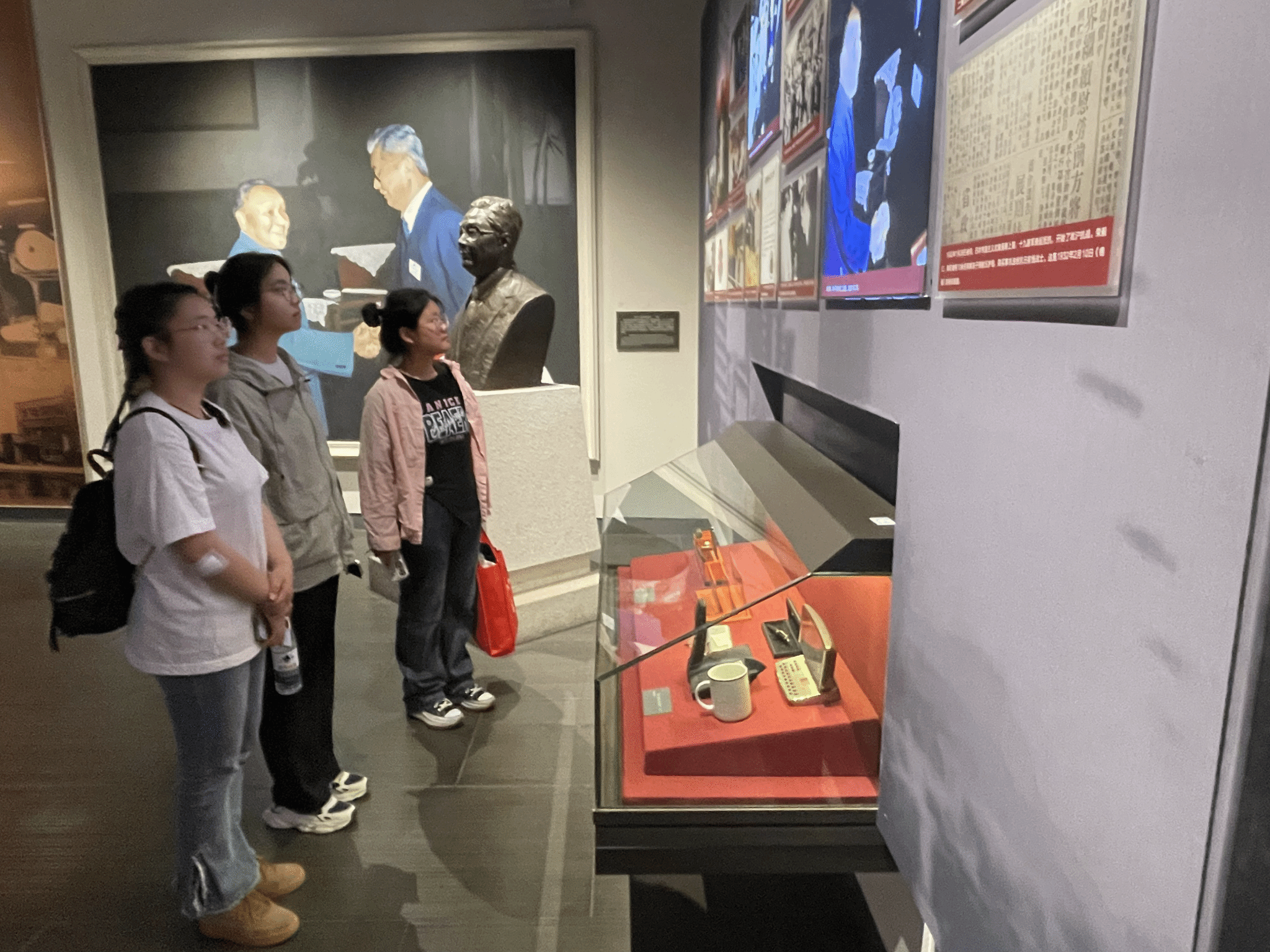 “红创实践团”的队员们参观了“泥塑雅韵”惠山泥人艺术展,馆内的众多惠山泥人作品彰显了惠山泥人独特的艺术魅力,一旁关于惠山泥人历史、文化、制作工艺等方面的介绍和展示,令人不禁感叹这一非物质文化遗产的价值和底蕴。在“肩负民族复兴希望的无锡人”展馆内,队员们重点学习了荣毅仁先生的生平事迹,深切感受到他那颗炽热的爱国之心,以及他为国家和民族所做出的卓越贡献。回想开源机器厂的历史,队员们纷纷表示,要将“开源”精神融入创新创业的实践之中,为中国式现代化贡献自己的力量。