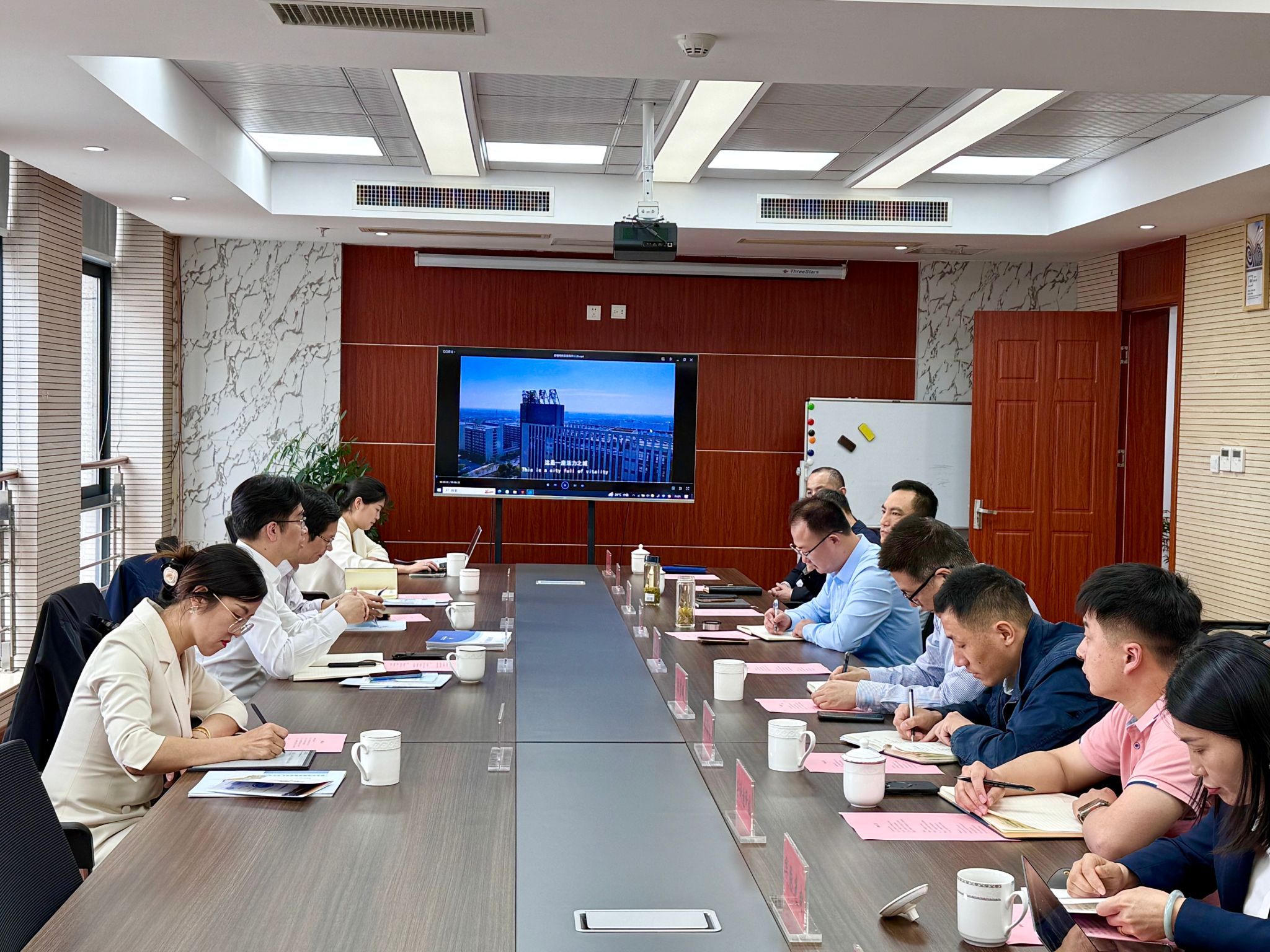 谢欢重点介绍了学院在学科布局和人才培养方面的特色优势,强调学院始终坚持应用型办学定位,致力于培养符合产业需求的高素质技术技能人才。副院长张文健则详细阐述了学院在物联网、人工智能等领域的科研创新成果,展示了学院在技术研发和服务地方产业方面的实力,并表示希望与高新区企业建立全方位、多层次的合作关系。高新区相关负责人系统介绍了园区产业发展规划及企业技术需求,期待通过校企合作实现资源共享、优势互补。