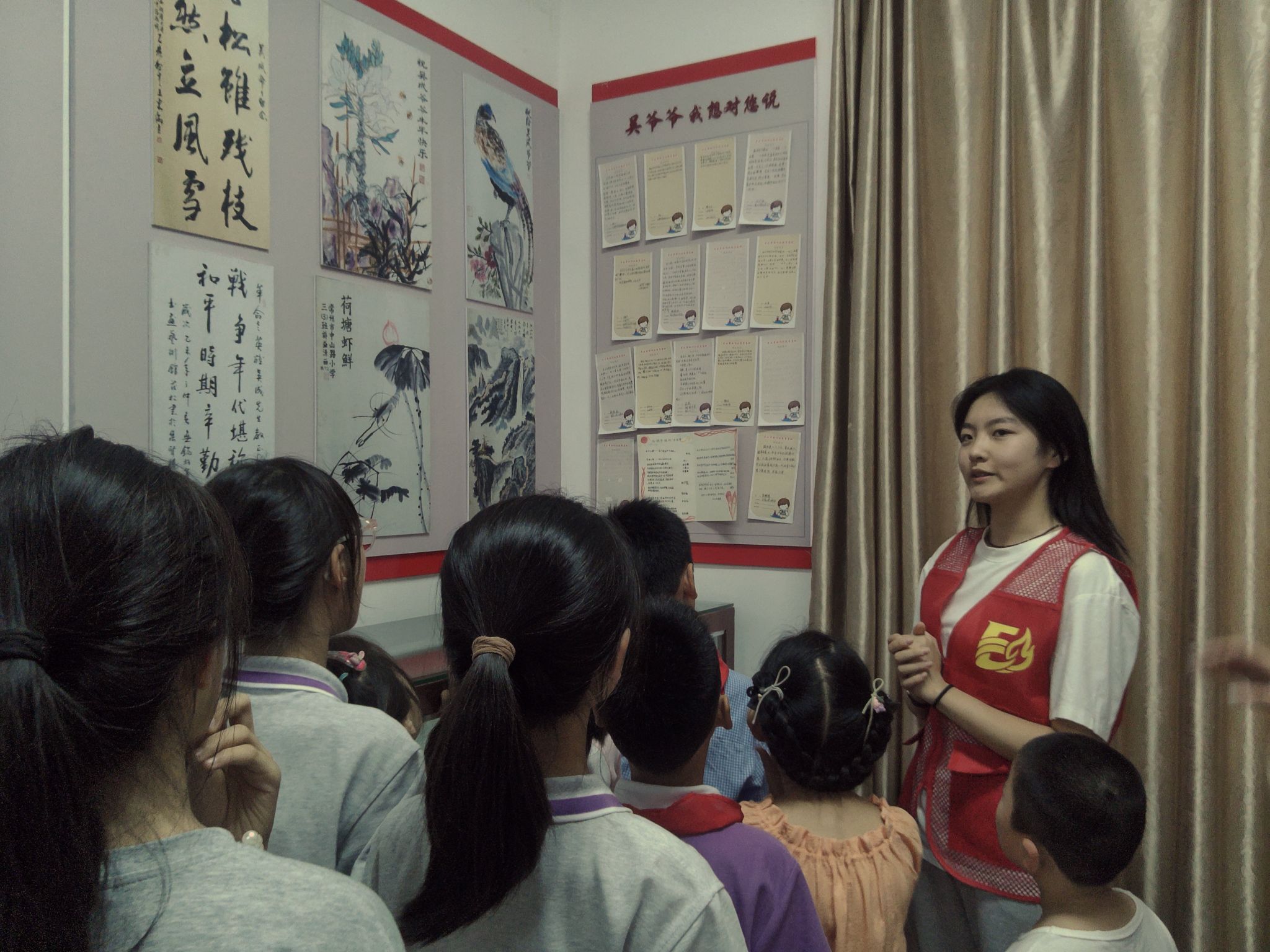 实践团成员将连日红色理论学习的积淀,转化为一系列深情而坚定的爱国实践。7月8日清晨,吴成革命教育基地迎来了20余名小学生。实践团成员们用生动的话语,将珍藏信件背后的红色故事娓娓道来。孩子们围聚聆听,眼神中闪烁着好奇与崇敬的光芒——红色精神,在这一刻悄然传递。