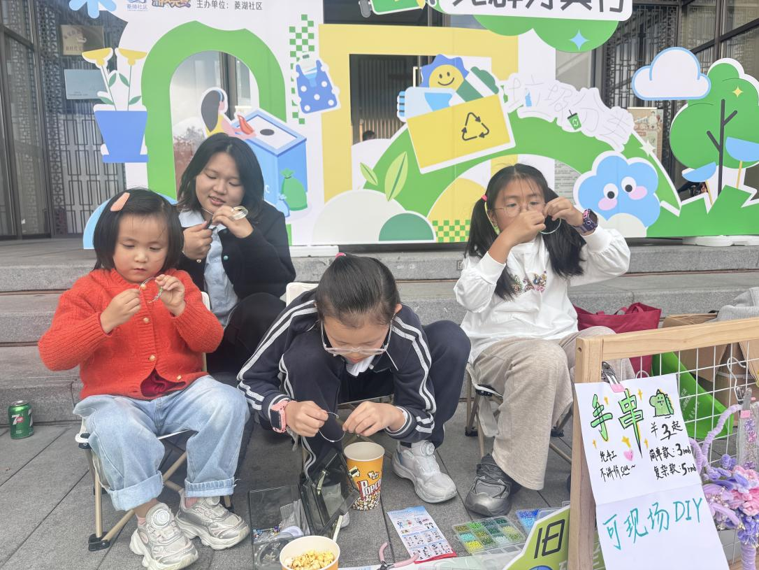 市集交易区人头攒动,财经学院“悦享TA力量”手作疗愈所的同学们精心布置摊位,带来的手工作品更是成为全场焦点,手工折纸、手串DIY、扭扭棒花束和团扇等吸引了大量小朋友驻足选购。互动体验中,同学们更是现场指导小顾客自己动手制作,一边耐心讲解制作步骤,一边分享手工作品制作背后的环保理念。同时,学生志愿者更是在活动中化身“环保使者”,不仅向社区居民和儿童发放环保知识小手册、垃圾分类宣传页,还倡导大家从日常生活入手,从小事做起,让家园更加美丽。在跳蚤市场的熙攘中,大家不仅获得了宝贵的生活体验,更在买卖间深刻领悟了低碳环保、勤俭节约的生活理念。