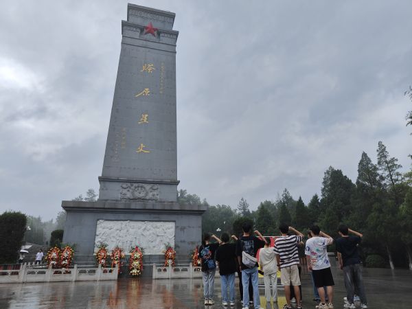 “八月桂花遍地开,鲜红的旗帜竖呀竖起来,张灯又结彩呀,张灯又结彩呀,光辉灿烂闪出新世界”。7日上午,在一个多小时的车程后,团队成员来到金寨红军广场,一到这里,同学们就听到这首大别山民歌《八月桂花遍地开》。随后,沿着具有不同含义的阶梯到达了广场中心——烈士纪念塔。与远处的高山遥遥相应,青山绿水长流生前浩气,苍松翠柏堪慰逝后英灵。大家纷纷冒雨默哀向先烈致敬,表达对先烈的崇敬。队长康锐研说,“金寨人民以大无畏的牺牲精神令我们钦佩,我们要跟着革命前辈的足迹继续前行”。
