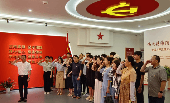 参观结束,全体党员在设计学院党总支书记苗勇的带领下举行了重温入党誓词仪式。在铿锵有力的誓言中,党员们面向鲜红的党旗,举起右拳,庄严宣誓,用铿锵有力的声音,再次重温了矢志不渝的誓言。