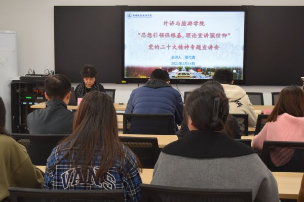 3月14日下午,外语与旅游学院在国际交流中心308会议室举办了信仰公开课“思想引领强根基,理论宣讲筑信仰”党的二十大精神专题宣讲会。学院关心下一代工作委员会邀请到市委党校一级调研员邓弋青教授主讲本次宣讲会。机关党工委第三支部和外语与旅游学院党总支学生党支部师生代表40余人参会。