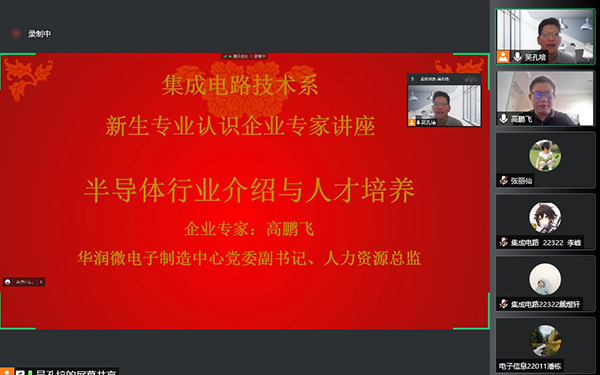 集成电路产业是当下信息技术产业的核心,也是支撑国家经济社会发展和保障国家安全的战略性、基础性和先导性产业,集成电路的发展成为了国家和大众关心的热点和“芯”病。为了帮助相关专业2022级新生更好地理解所学专业内涵、了解行业发展,加深对所学专业的使命感与认同感,树立“技能成才、强国有我”远大志向,9月17日下午,控制技术学院党总支携手党建联盟单位华润微电子制造中心,开展“专业赋能助成长 党建联盟共育人”新生专业认知活动。华润微电子制造中心党委副书记、人力资源总监高鹏飞通过线上方式为电子信息、集成电路、应用电子专业新生开展专题讲座,全体电子大类专业新生参加此次讲座。