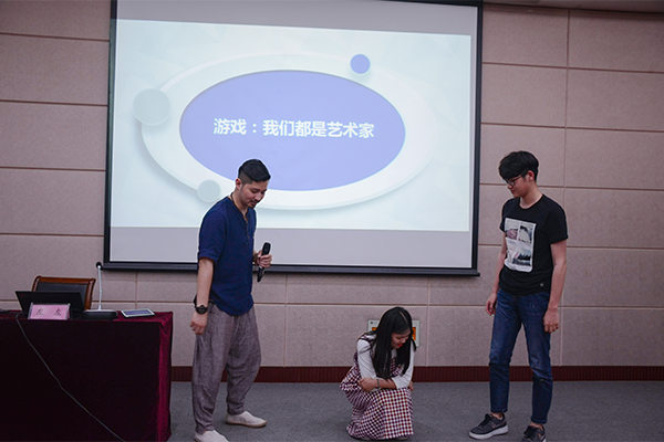 讲座尾声,左左老师和同学们一起玩了“泥团游戏”、“纸条游戏”两个即兴表演的游戏,让大家更加直观地感受到导演对剧中人物的塑造和引导作用,赢得广大师生的阵阵喝彩。