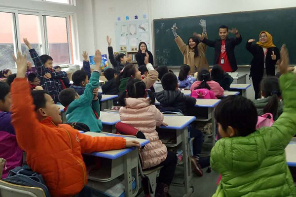 外旅学院旅游专业志愿者们协助MSU师生团与万科育红小学的学生们开展了一次别开生面的交流活动。MSU学生们通过有趣的游戏向小学生们展示了马来西亚的民族特色和民族文化,给万科育红小学的学生们带来了异国的友谊和关爱。