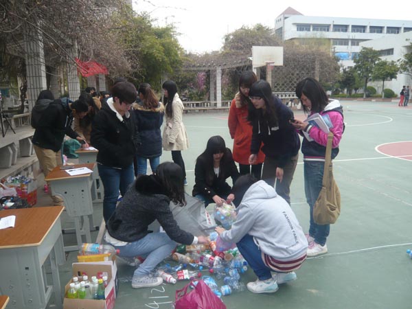 本次活动主要内容是同学们以宿舍为单位,用塑料瓶或旧电池兑换购物袋、作业本等生活、学习用品。活动吸引了大批同学们前来参与,并发动身边朋友搜集塑料瓶等废弃物。(王迎)
