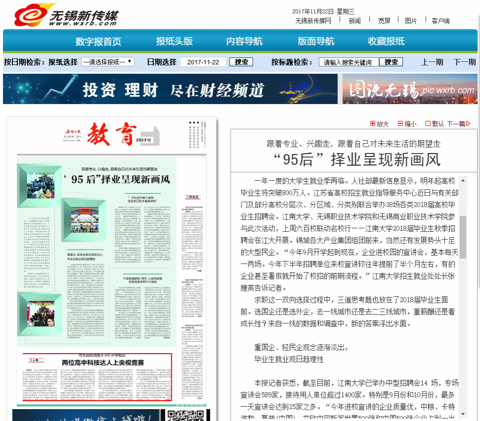 【无锡日报】“95后”择业呈现新画风