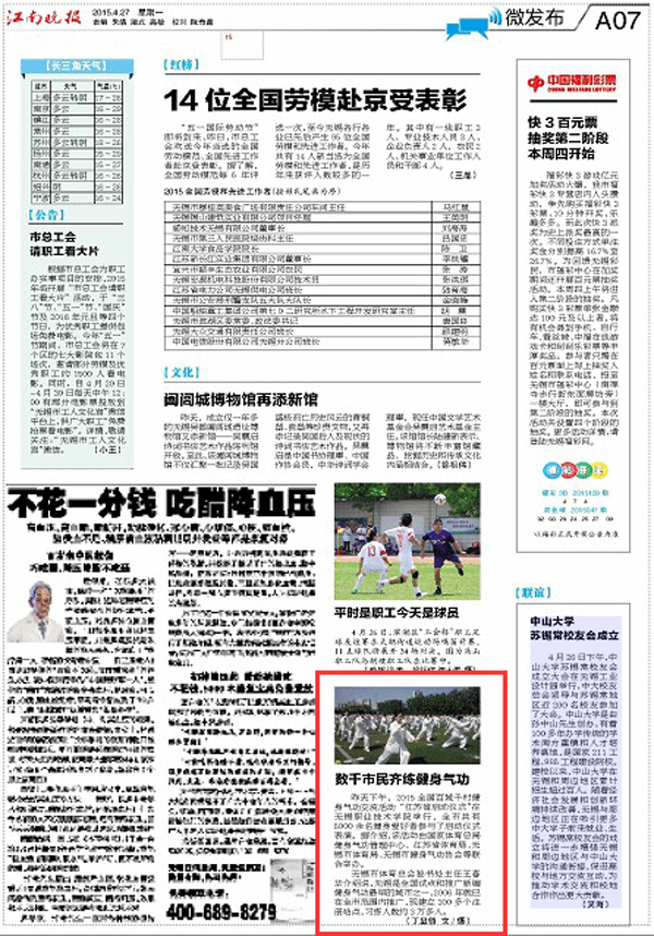 昨天下午,2015全国百城千村健身气功交流活动“江苏省启动仪式”在完美官方网页版举行,全市共有5000余名健身爱好者参与了启动仪式表演。据介绍,该活动由国家体育总局健身气功管理中心、江苏省体育局、无锡市体育局、无锡市健身气功协会等联合举办。
