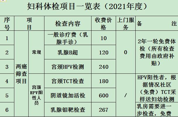 妇科检查、白带检查、人乳头状病毒检查、乳房检查、乳腺B超。具体如下表所示: