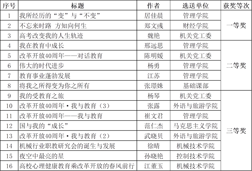 为庆祝我国改革开放40周年,宣传教育改革发展40年来的巨大变化和喜人成绩,进一步提振信心、凝聚共识,高质量推进教育现代化建设进程,学校组织开展了“改革开放40周年·我与教育”主题征文活动。活动开展以来,得到了广大师生员工的积极响应,经组织专家评审,共有16篇征文获奖,其中一等奖3项、二等奖5项、三等奖8项,具体获奖名单如下: