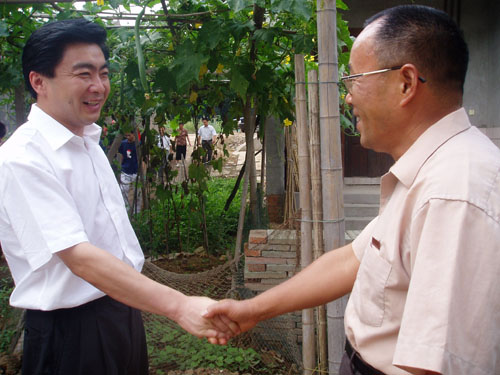 2004 年 9 月 9 日,市委书记王荣(左)向我院市优秀教育工作者倪森寿老师表示慰问。